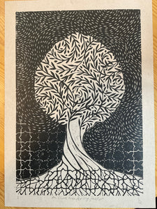 Olive Tree block print. £20 per print will go to the charity Medical Aid for Palestinians (MAP)